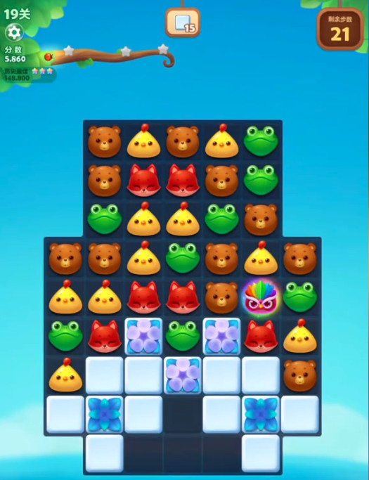 激活墨鱼仔后它会向右侧飞行并击碎阳光瓶,从而在棋盘右上方释放更多小动物并生成黄叶堆。这时需要集中利用右侧掉落的小动物进行三消,逐步向下清除黄叶堆以拓展操作空间。过程中尽可能利用自然形成的特效来加速消除,例如横向或竖向特效,这能有效节省步数并连锁清除多个障碍。